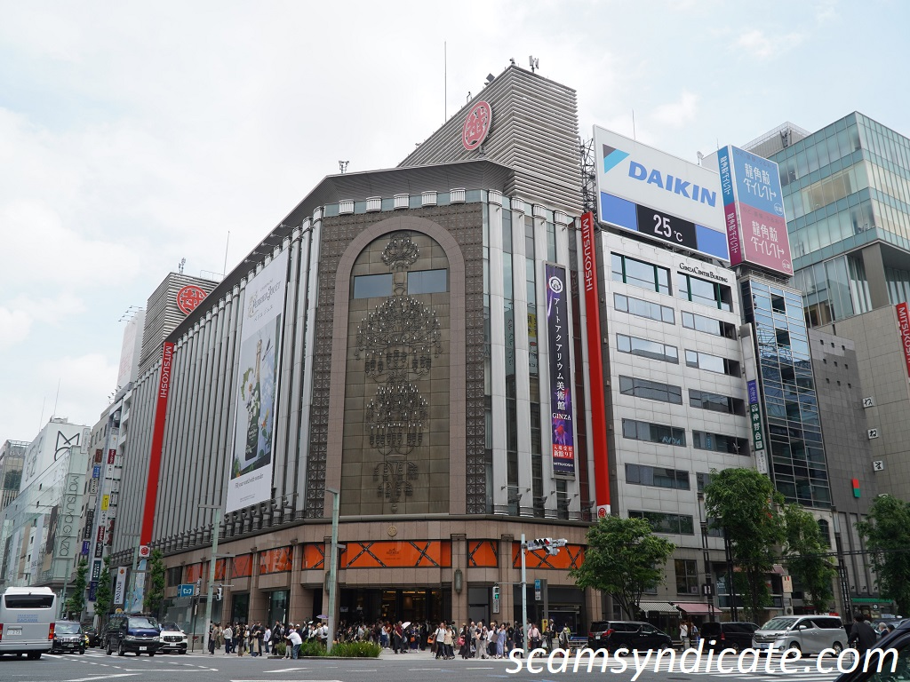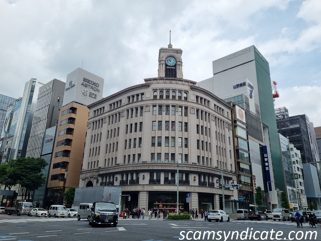 Luxury shopping district with flagship stores like Mikimoto and Wako clock tower.