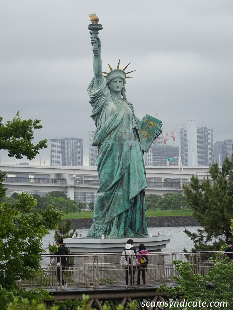 Mini replica of NYC’s statue with Rainbow Bridge backdrop.